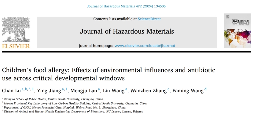 2024年5月6日,91AV劳动卫生与环境卫生系路婵教授团队的研究成果 “Children's food allergy: Effects of environmental influences and antibiotic use across critical developmental windows” 在国际环境健康领域权威期刊Journal of Hazardous Materials(IF:13.6,JCR Top 5%,中科院1区TOP)以Research Paper发表。路婵教授为该文唯一通讯作者和共同第一作者,91AV