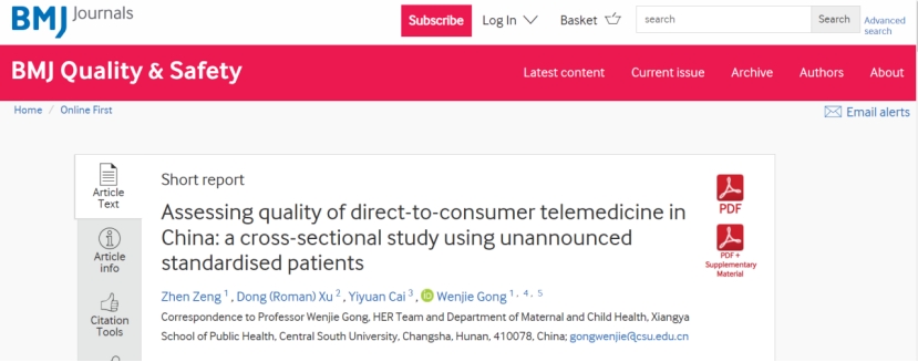 (IOM)质量框架,首次对中国互联网诊疗平台上提供的在线诊疗服务进行了系统评估。结果发现,访问成功率仅为63.5%(108/170)。成功完成的访问中,仅有49次咨询(45%)获得了正确诊断,问诊完成率和处置完成率仅为15%和31%。其中实体医院平台虽然在数量上已成为互联网诊疗的主体,但在咨询可及性、响应时间和依据指南的处置依从性上均不及发展历程更长的第三方平台。本研究结果提示当前中国线上诊疗质量并不理想,要将线上诊疗作为传统医疗的有效补充,还需要比较线上诊疗相对于线下门诊的质量差异并分析其原因,以应对线上诊疗存在的特有问题和挑战。本研究“Assessing quality of direct-to-consumer telemedicine in China: a cross-sectional study using unannounced standardised patients”于4月30日以Short report形式发表于BMJ Quality & Safety(IF:5.7,中科院1区),2020级博士研究生曾榛为第一作者。