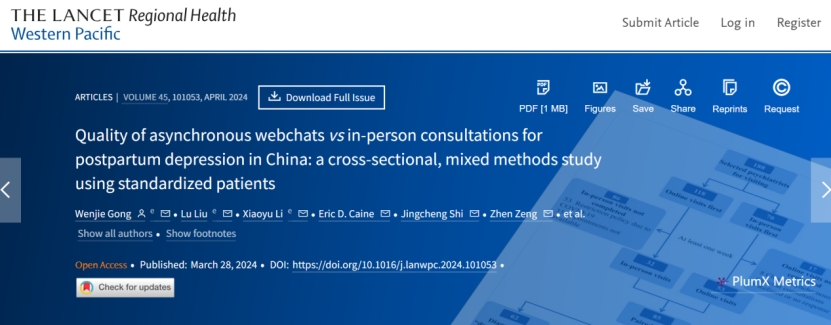 研究结果“Quality of asynchronous webchats vs in-person consultations for postpartum depression in China: a cross-sectional, mixed methods study using standardized patients”于3月28日在The Lancet Regional Health-Western Pacific(IF:7.1,中科院1区)在线发表。HER Team 2019级硕士研究生刘璐与2021级硕士研究生李小宇与龚雯洁教授并列为第一作者。