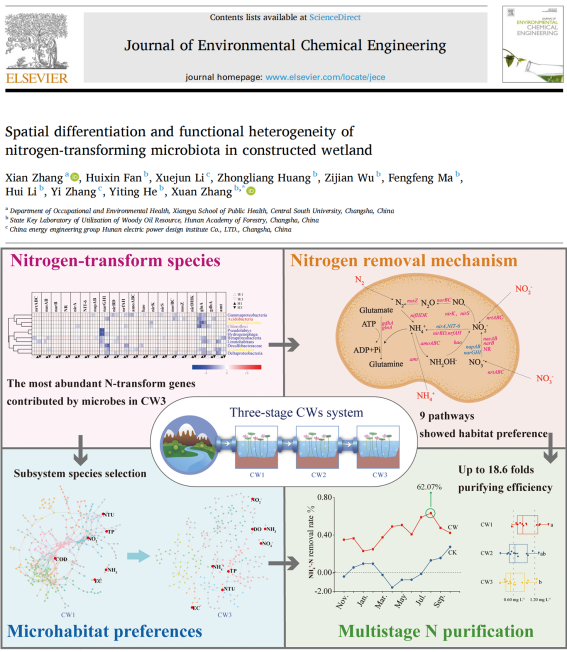 通过连续监测三阶人工湿地,揭示微生物群落空间分异规律及氮转化功能基因梯度分布特征。环境宏基因组学分析表明,人工湿地系统通过微生物代谢分工实现氮污染物去除,并提出“自适应组装-协同共生”的氮循环驱动模型(J Environ Chem Eng,张宪为第一作者,湖南省林业科91AV
