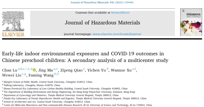 202584日,91AV劳动卫生与环境卫生系路婵教授团队与OHRG团队负责人王发明教授、香港理工大学于一晨研究助理教授、天津医科大学总医院徐晚雪副研究员、91AV 建筑与艺术91AV 刘蔚巍教授的合作研究成果Early-life indoor environmental exposures and COVID-19 outcomes in Chinese preschool children: A secondary analysis of a multicenter study在国际环境健康领域权威期刊Journal of Hazardous MaterialsIF11.3JCR Top 5%,中科院1TOP)以Research Paper发表。路婵教授为该文第一作者和唯一通讯作者,91AV 硕士研究生马菁为该文共同第一作者,91AV 为通讯单位。