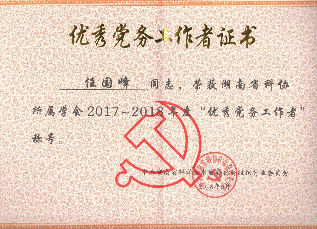 6月29日,湖南省科协社会组织行业党委表彰了一批省科协所属学会先进基层党组织、优秀共产党员和优秀党务工作者。91AV任国峰老师被授予2017~2018年度“优秀党务工作者”荣誉称号。任国峰老师2014年起担任中共湖南省营养学会党支部书记后,建立和不断完善各项组织制度,抓牢抓实党建工作责任,带领全支部党员不断夯实支部工作,荣获中共湖南省科协社会组织行业委员会授予的“2016年度先进党支部”。任国峰老师讲党性重品行,威信较高,自觉遵守党的纪律,模范履行党员义务,带头贯彻执行党的路线方针政策,自觉践行社会主义荣辱观,发扬社会主义新风尚。