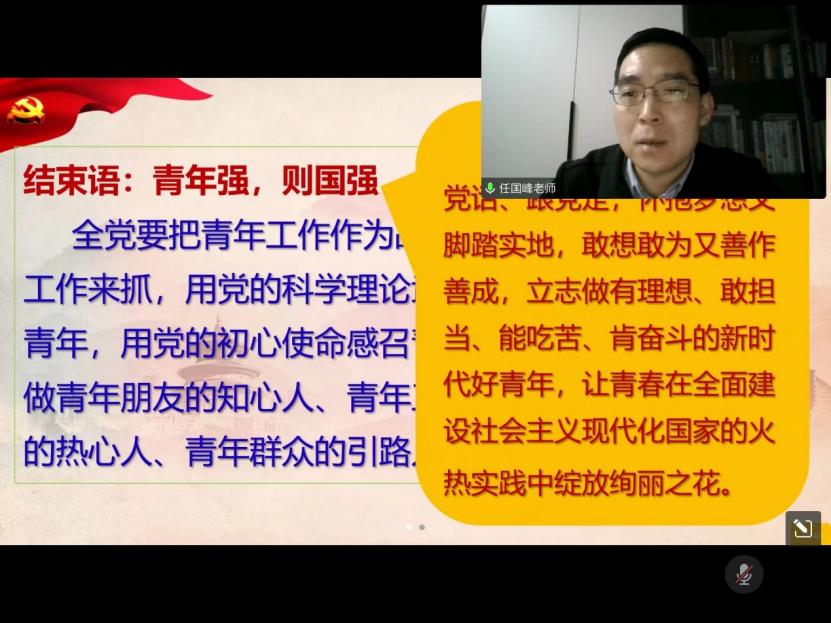 任国峰副院长向党员同志们解读党的二十大主题,以党的二十大报告要点为主线,分别从五个方面内容解读党的二十大精神。关于新时代十年伟大变革,要求我们要从学习中进一步坚持四个自信,坚定政治站位,汲取奋进力量;关于马克思主义中国化时代化新境界,阐述了“两个结合”要求,精辟概括了习近平新时代中国特色社会主义思想贯穿的世界观和方法论,号召全体党员继续推进实践基础上的理论创新、不断开辟马克思主义中国化时代化新境界;关于以中国式现代化全面推进中华民族伟大复兴,要求全体党员把思想和行动统一到党的二十大精神上来,心往一处想、劲往一处使,在中国式现代化道路上不断谱写全面建设社会主义现代化国家新篇章;关于实施科教兴国战略与重大部署,指出教育、科技、人才是全面建设社会主义现代化国家的基础性、战略性支撑,号召全体党员要坚持尊重劳动、尊重知识、尊重人才、尊重创造;关于深入推进新时代党的建设,指出我们身处这样一个伟大的时代,每位党员都要时刻提醒自己严以律己、重任在肩,践行“忠诚、干净、担当” 要求。