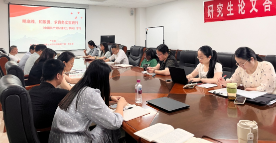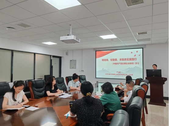 B328会议室召开了主题为“明底线、知敬畏,求真务实重践行”的《中国共产党纪律处分条例》专题学习会,雷先阳书记及系全体教职工参会,系副主任、职工第一党支部书记严俊霞老师主持会议。