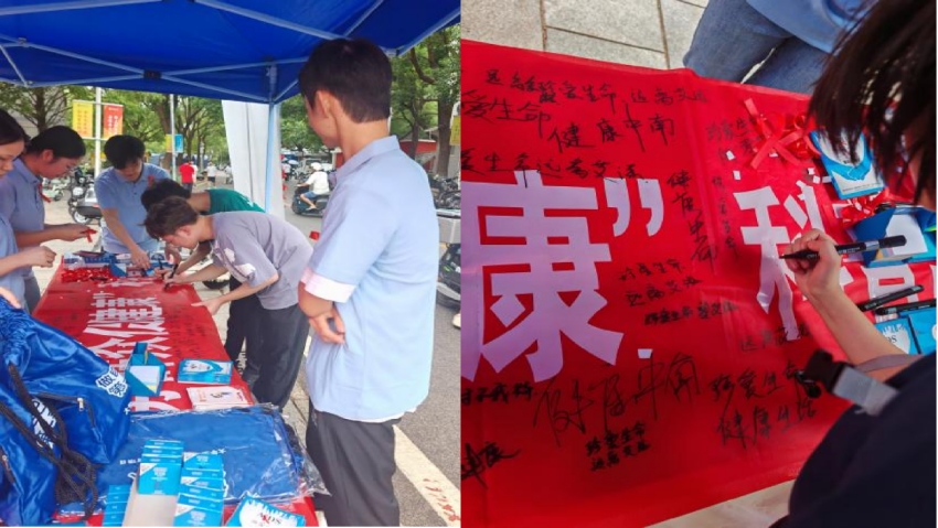 南校区二食堂前坪,搭建起帐篷,铺好桌子,摆放笔筒、红丝带、背包奖品,借助横幅、展板、易拉宝、海报等开展防艾宣传活动。志愿团成员向过往同学发放防艾知识手册、讲解艾滋病相关知识,并邀请同学们在活动横幅上签名、书写防艾寄语、粘贴红丝带。丰富多彩的宣传方式,吸引了大量青年学子驻足参与,志愿团成员利用专业知识,耐心细致、科学通俗地解答了同学们提出的有关问题。