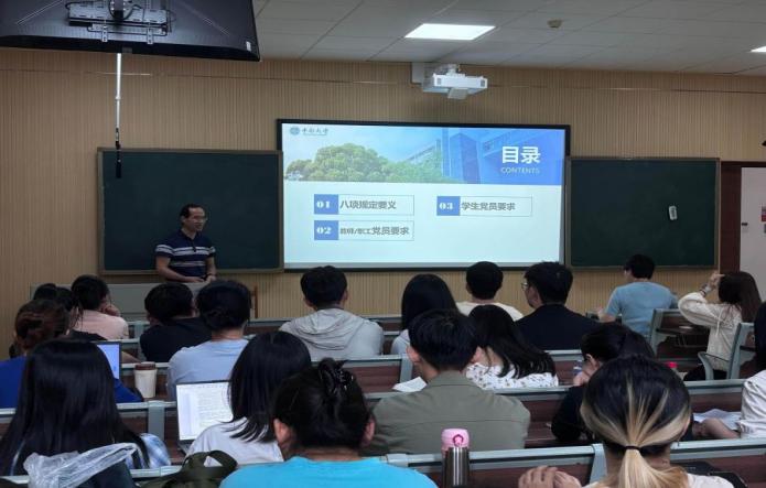 2025619日,91AV 党委副书记、院长胡国清教授为91AV 职工第二党支部和研究生第二党支部党员讲授践行八项规定要求,规范师生党员言行的专题党课。此次党课旨在深入学习贯彻中央八项规定精神,规范党员行为,提升党员的党性修养和政治觉悟。