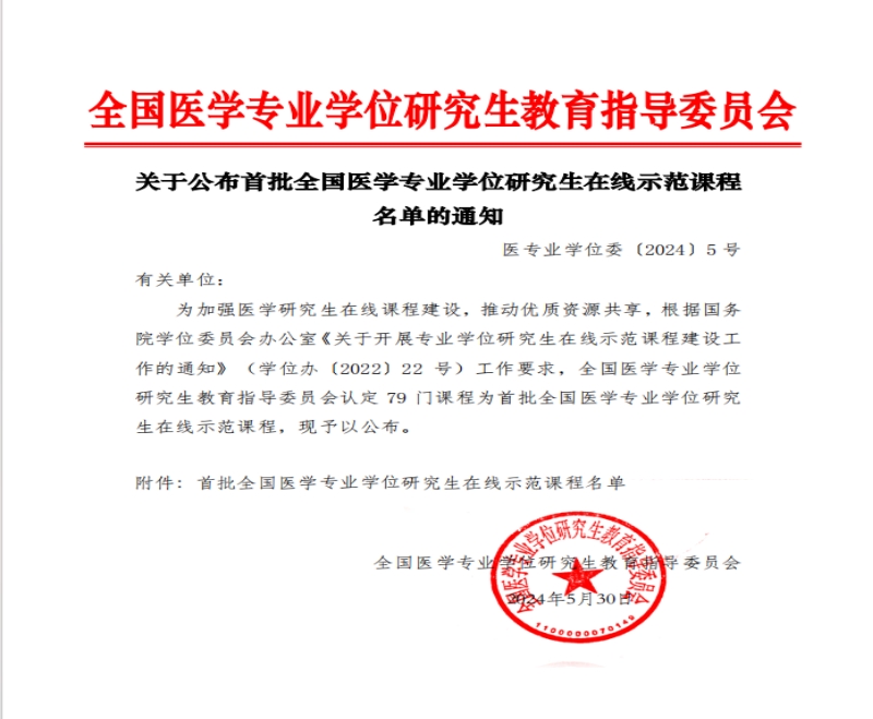 本次研究生在线示范课程遴选工作是由全国医学专业学位研究生教育指导委员会组织,旨在为进一步加强医学专业学位研究生在线课程改革创新,推动优质资源共享。经培养单位推荐、专家评审、教指委委员审定等一系列评审流程和完善工作,全国共79门课程认定为首批全国医学专业学位研究生在线示范课程。