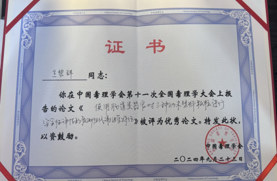 、南方医科大学等60余所高等院校专家、学者的参与,参会人数超过1500人。大会设立了“优秀报告论文奖”,共有116位来自不同院校的教师和学生提交论文参与角逐。91AV博士研究生宣黎辉的论文“使用肠道类器官对三种纳米塑料颗粒进行安全性评估的预测性代谢组学特征”在本次大会中脱颖而出,受到评委的一致好评,并荣获“第十一次全国毒理学大会优秀报告论文奖”。
