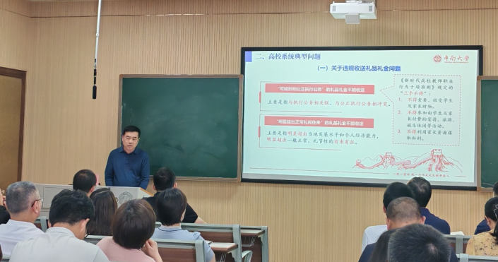 卜世波围绕八项规定改变中国、高校系统典型问题、持续筑牢作风防线三个方面,深刻阐释了中央八项规定精神核心要义与深刻意义,通过剖析高校系统存在的11大类典型问题,明确了干部职工行为规范的边界底线和如何贯彻落实作风建设的任务要求。他指出要强化日常监督机制防范廉政风险,深化思想教育,筑牢廉洁自律根基,推动纪律意识深度融入教学科研管理各环节。