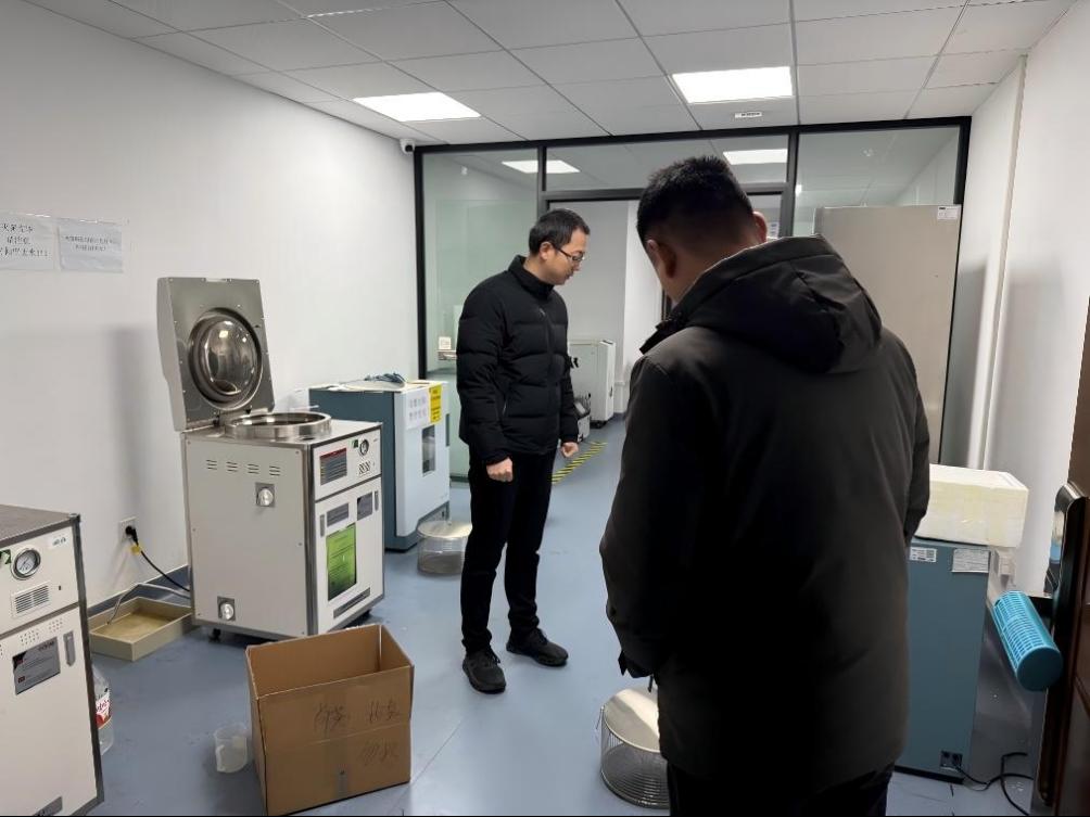 在位于学院负一层的实验室区域,开天瀚副院长对实验样品库中低温冰箱的运行状态、实验室安全制度落实及安全责任履行情况等进行了细致检查。他强调,实验室是开展教学与科研工作的重要场所,必须严格执行学校及学院关于寒假期间安全稳定工作的各项要求,并叮嘱实验室管理人员务必保持高度警惕,确保各项安全措施落实到位