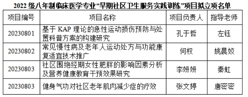 评审,拟确定2022级八年制临床医学专业“早期社区卫生服务实践训练”项目立项4项,现将名单进公示。公示期:2023年8月23日至8月25日。