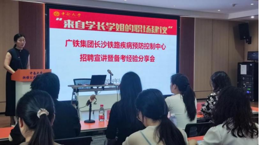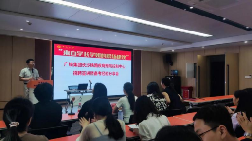 接下来,刘红校友向大家介绍了中国铁路广州集团有限公司长沙铁路疾病预防控制中心的概况,包括招聘岗位和条件、历年招聘情况等,向大家介绍了曾婷、岳婷婷、李雅琪、李超凡四位目前就职的优秀校友,鼓励毕业生们积极报考,希望有更多校友融入广铁集团大家庭。