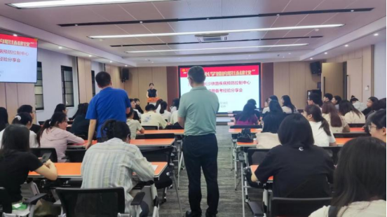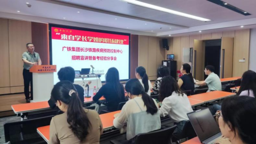 邀请中国铁路广州集团有限公司长沙铁路疾病预防控制中心人事劳资科科长刘红、团支部书记曾婷等五位校友来院为在读学弟学妹进行广州铁路局疾控所招聘宣讲及备考经验分享,开展访企拓岗就业专项活动。会议由学工办副主任尹逊强老师主持,91AV