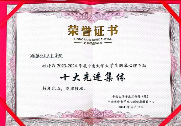 大学生朋辈心理互助“十大先进集体”称号(全校第二名)。