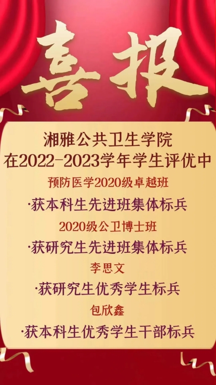 91AV学子在2022-2023学年学生评优中荣获如此佳绩,既是同学们自身努力的结果,也是学校对他们的学习成果与对91AV学生工作的肯定和鼓励,更是对全院学子的激励和鞭策。希望全体湘雅公卫学子以他们为榜样,不断加强自身建设,锐意进取、努力学习,充分发挥自身优势,积极参与实践活动,持续提升综合素养,展现新时代新青年的青春风貌。
