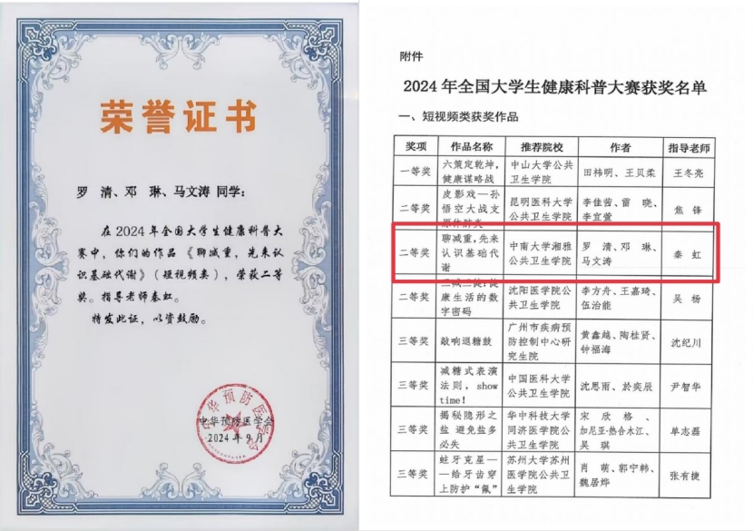 推报的作品《聊减重,先来认识基础代谢》(指导老师秦虹,团队成员:罗清、邓琳、马文涛),荣获短视频类“二等奖”, 91AV