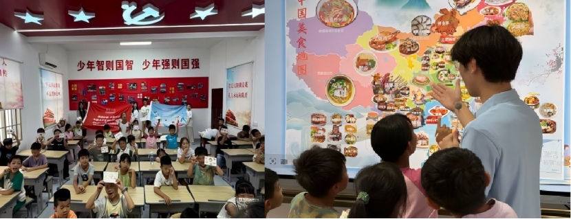 支教队结合江华本土饮食文化,与孩子们畅聊“江华腊肉”“油茶”等家乡美食,此外,还分享了前期调研制作的中国美食地图,激发孩子们对各地美食的向往,让中国饮食文化在孩子们心中扎根,悄然培养了他们的家国情怀。