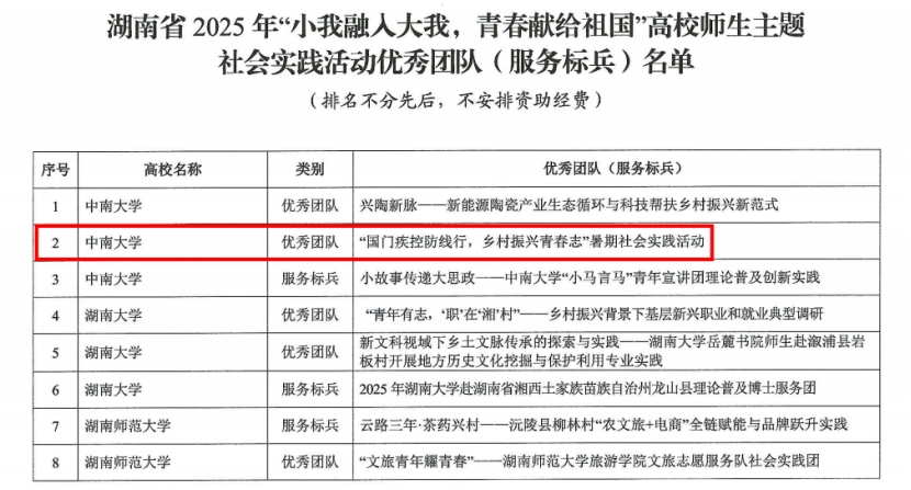 近日,中共湖南省委教育工委、湖南省教育厅发布了《关于公布湖南省高校2025小我融入大我,青春献给祖国高校师生主题社会实践活动优秀团队(服务标兵)名单的通知》。经各高校推荐、资格审核、专家评选,91AV 国门疾控防线行,乡村振兴青春志社会实践团表现优异,荣获全省优秀团队荣誉称号。
